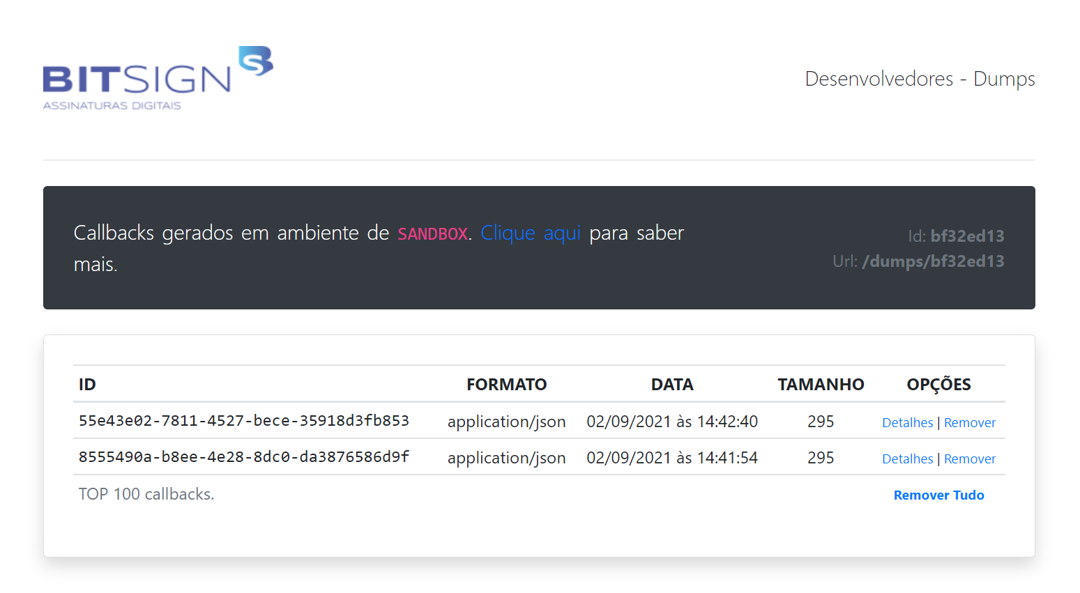}Caso não tenha um ambiente definido para callbacks, e mesmo assim quer ter a chance de visualizar os eventos gerados pela plataforma, você pode optar por utilizar o Serviço de Dumps da BITSIGN. Este serviço permite você criar um ambiente totalmente "descartável" para receber as requisições de callbacks, que pode ser útil até que se tenha um ambiente real e de produção para recepcionar estas notificações. Para habilitar este serviço, que está disponível apenas em ambiente de SANDBOX, basta ir até as configurações da aplicação e utilizar a opção para gerar o repositório; um link randômico será gerado e você poderá utilizá-lo para visualizar todos os eventos que estão sendo gerados.