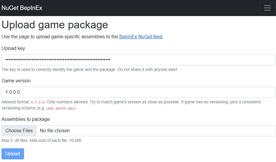 For UnityMono games: Upload original game assemblies that are not publicised and not stripped. The assemblies will be automatically stripped and publicised before they are pushed to NuGet.