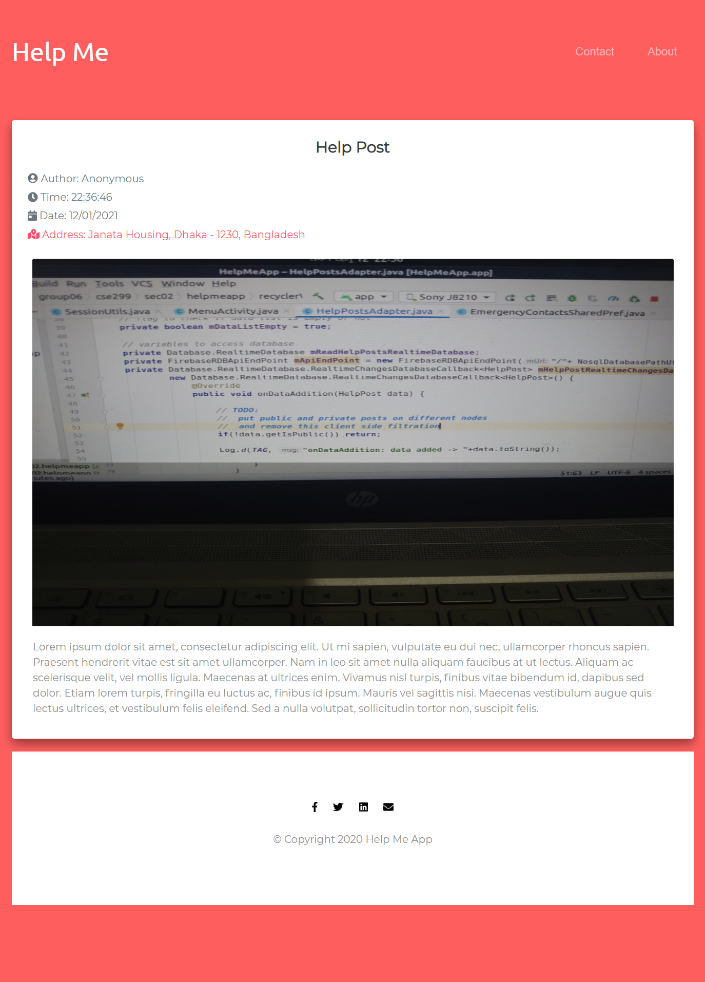 Help Post Page: This is the main page of the Web App that shows the exact ‘Help Post’ that user posted. The ‘Emergency Contact’ users will get the link of this page as a sms and will be directed into the page showing the full help post. This is the only dynamic web page of this application. If the android app fails to get the formatted address as the post address, the user can view the formatted address by clicking on the address field of the post. The users can also view the location on map by clicking the address field of the post. This will take them to the google map and they can view the location from native google map application or on the web map.
