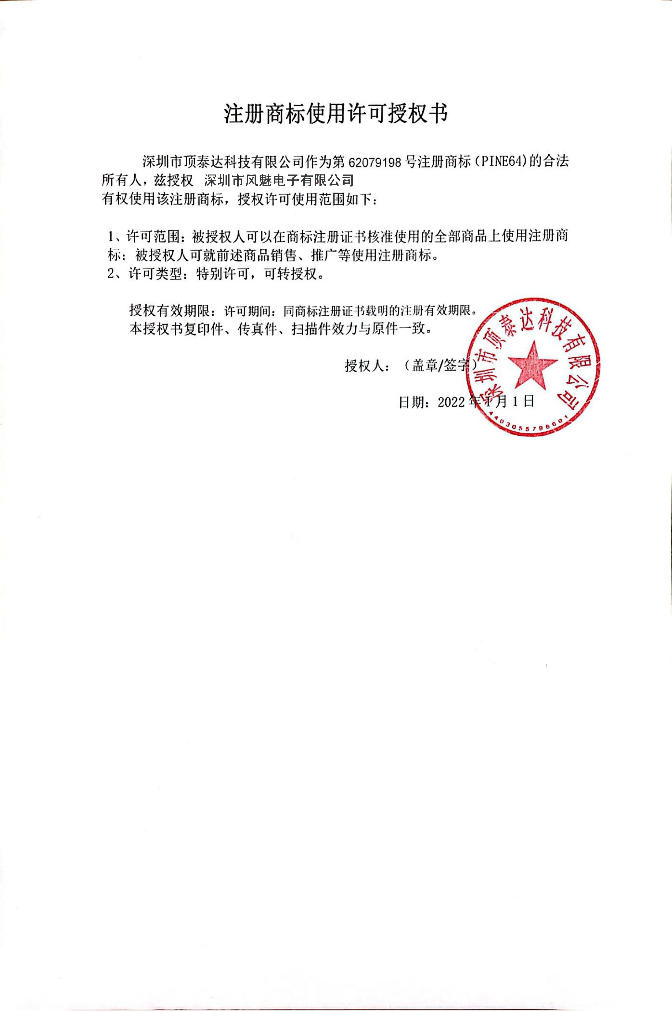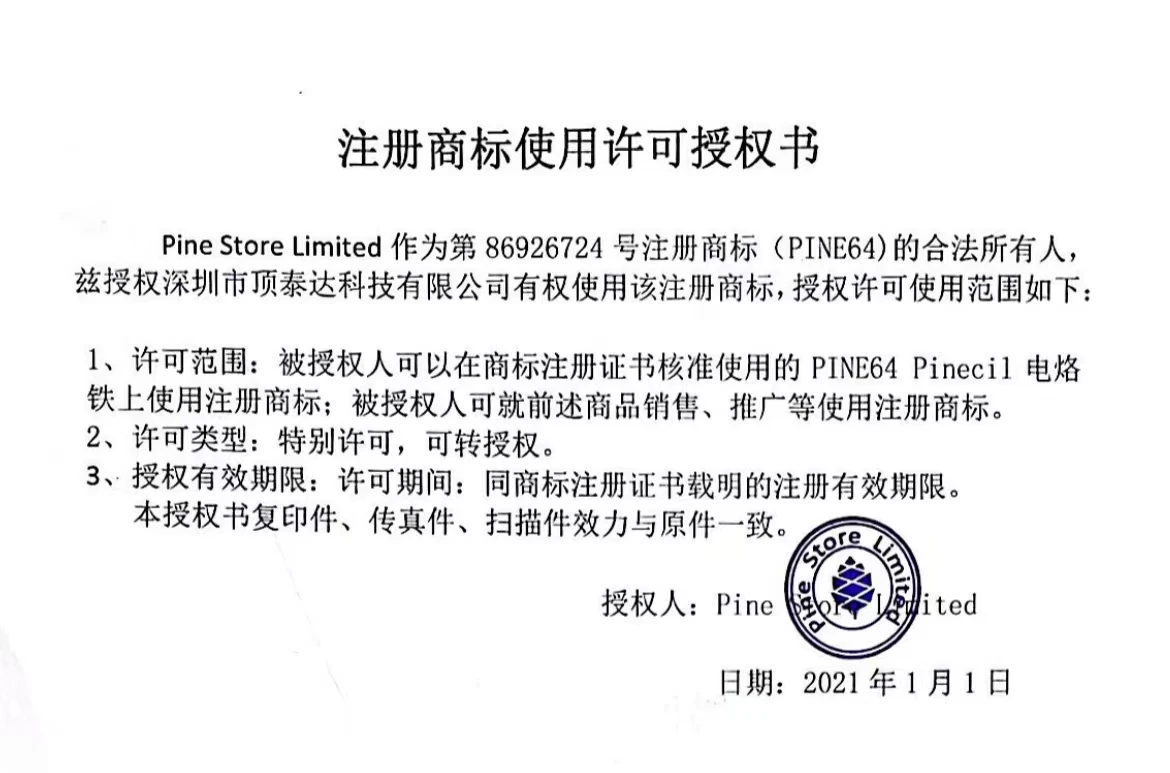 Someone in Live community Pine64 chat look at that "letter" in chinese. It is not signed, it looks like something someone just typed it up and then copied in a Pinecone logo. They claim in that "document" that Pine store authorized "Shenzhen Dingtaida Technology Co." to use the trademarks and logos. The document lacks any legal certifications, it might just be another fake. FMChip Global operates under the business name of "Shenzhen Fengmei Electronic Co.,Ltd." So the document says some other company, NOT them, has permission to use the Pine Store logos/trademarks. don't have any more information. I have no idea how that document, even if it were real would help "FMCHIP Global" fake copy seller at all since it is: