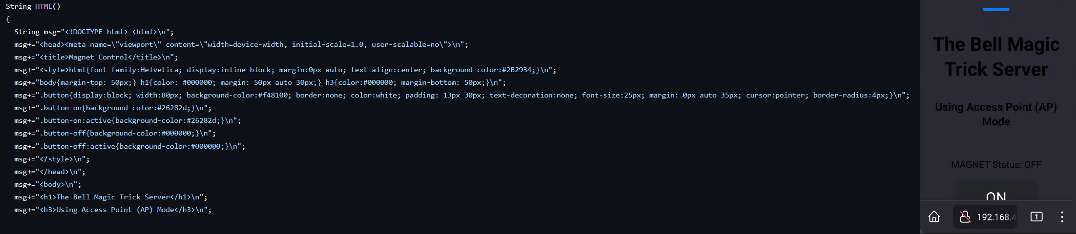 To control the bell, the Wemos D1 Mini acts as an access point and creates a web server. By connecting to the device and heading to the IP address 192.168.4.1, a webpage loads which has one button on it in which you gain the ability to control the bell wirelessly, allowing you to turn it on and off remotely. This wireless control enhances the illusion, making it seem as if a ghostly force is responsible for the bell's movement. Its great because in this day and age, a person is always on their phones!!! so its looks more natural than a person holding a random garage remote or something in their hands hahahaha.