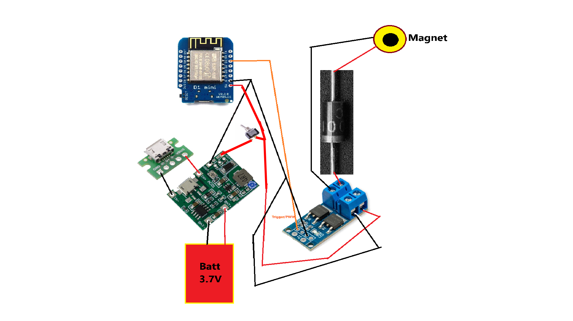 The magic trick involves the use of a Wemos D1 Mini (Arduino Programmed), a 5V Electromagnet, and a bell to create the illusion of a ghostly presence. The Electromagnet is strategically attached to the underside of the top of the box, in close proximity to the bell (which is hanging just above the Electromagnet), and is controlled by the Wemos D1 Mini through a MOSFET Power Switch (soldered to D1). When triggered, the Electromagnet activates for 1 second, followed by a 0.5-second pause, causing the bell to sway and, consequently, produce the eerie ring.