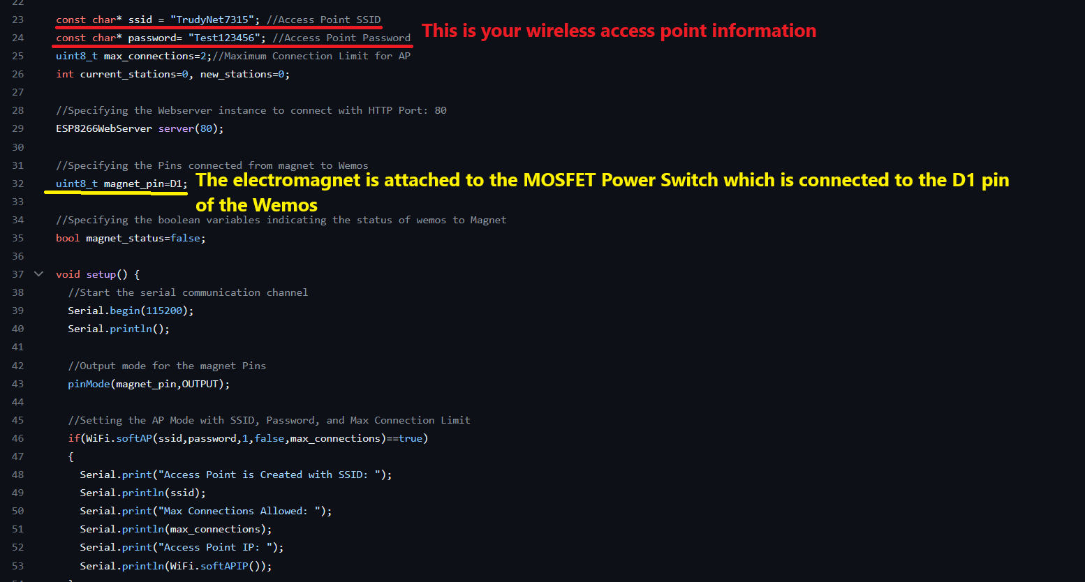 This is where you can change the the Wireless Access point and/or Password and which pin is the mosfet attached to, to make it easier on yourself.