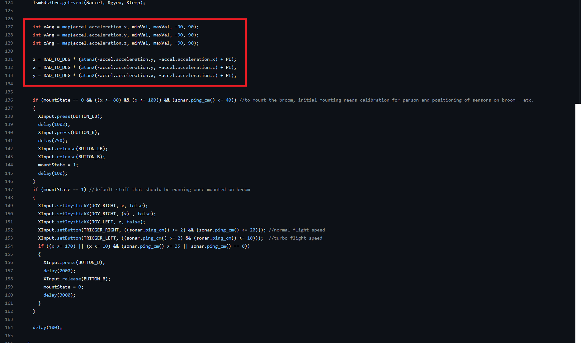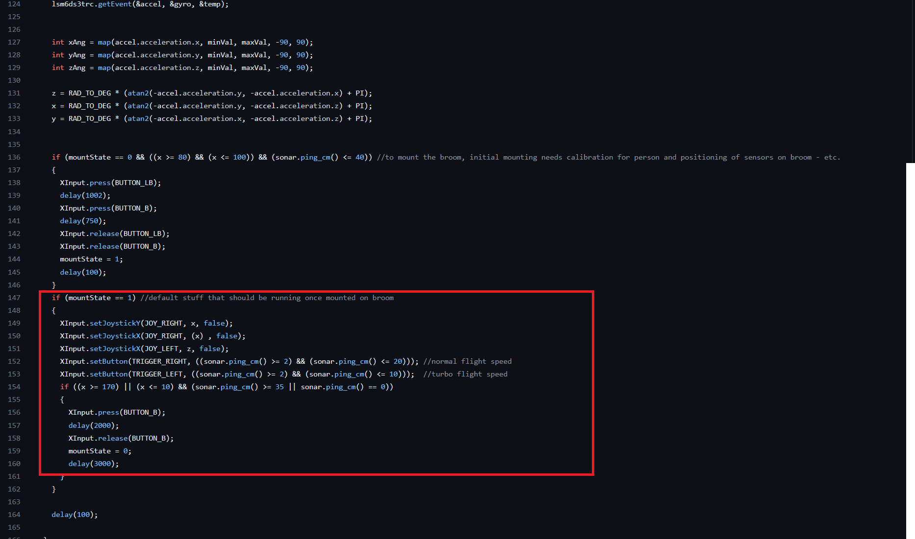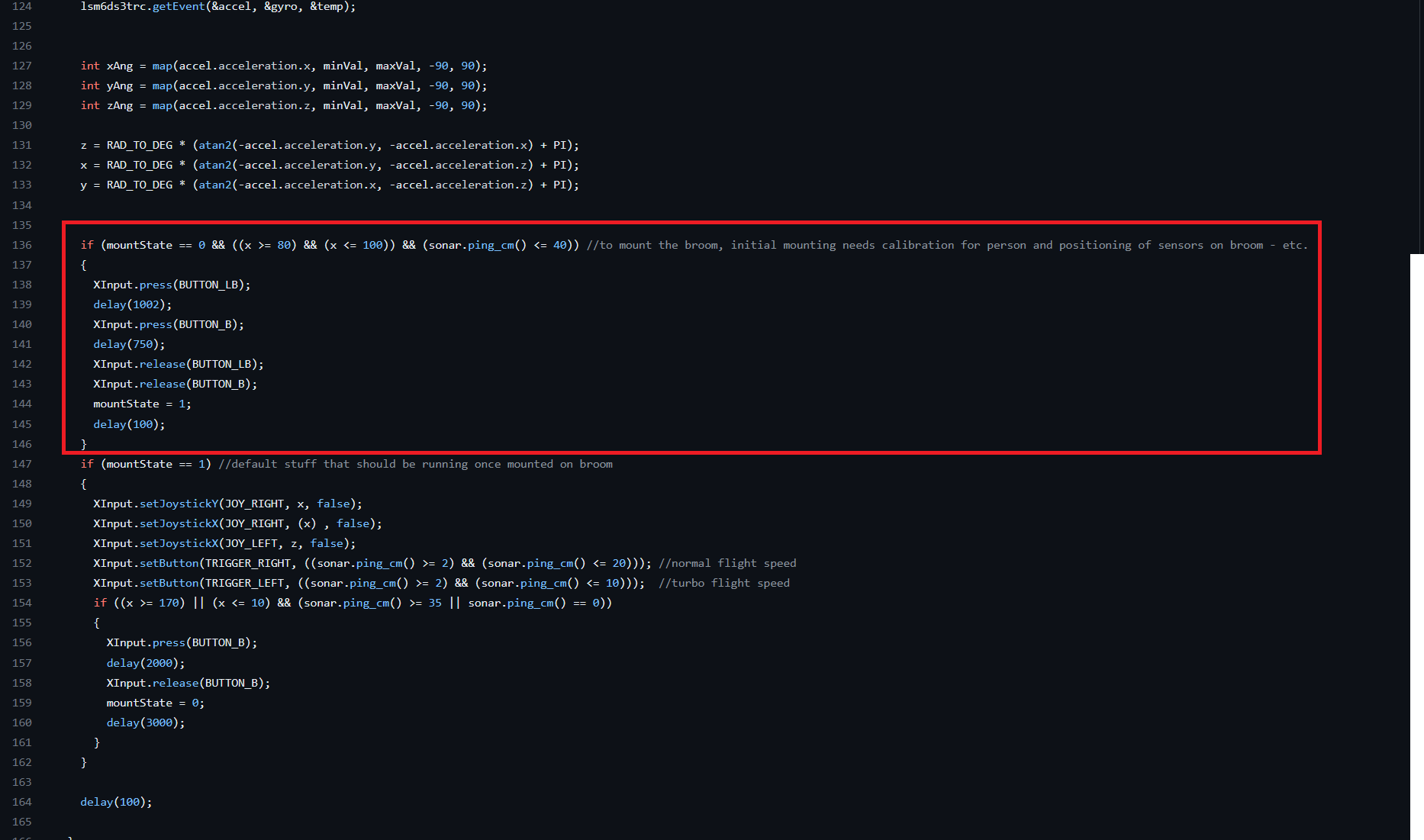 Once all three conditions are satisfied, the Arduino sends out a xinput command to essentially mount the broom in game. It will Hold LB for 1 second, press B for ¾ of a second and then release the hold of the two buttons and change the mountstate to 1. So at this point you should be in person mounted on your broom while your character is doing the same.