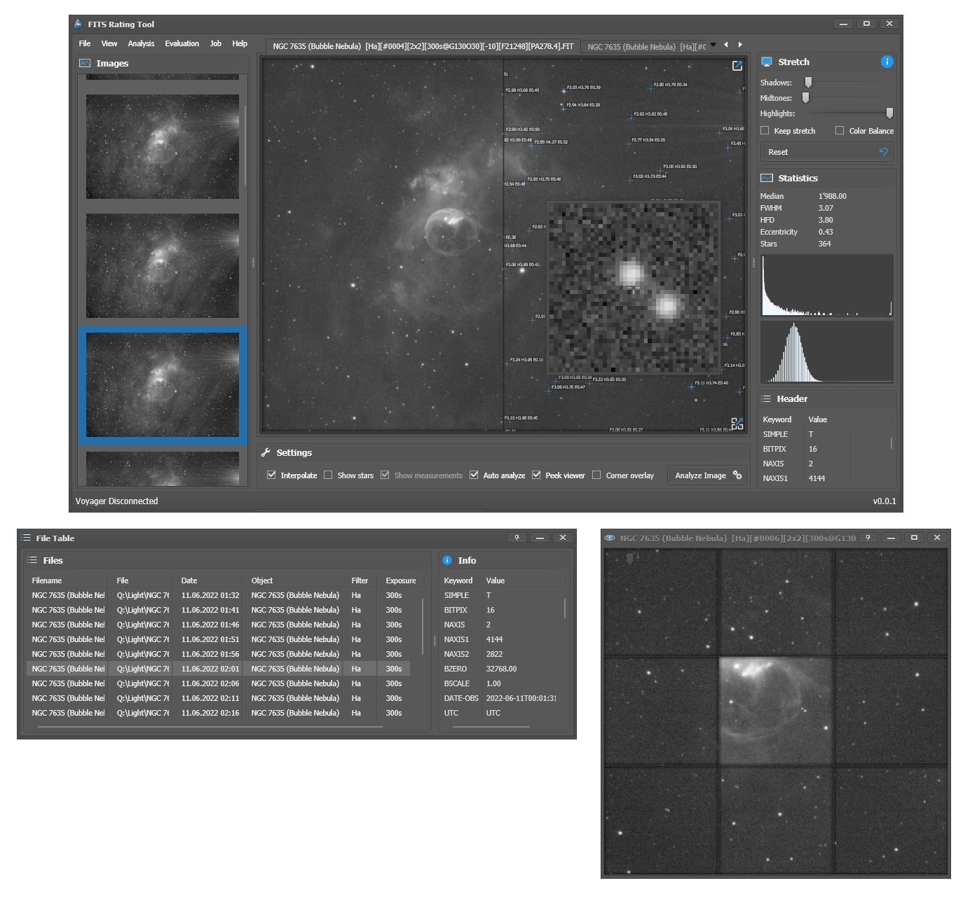 - FITS viewer with auto-stretch, rudimentary RGB/debayer support, corner/aberration viewer and peek viewer