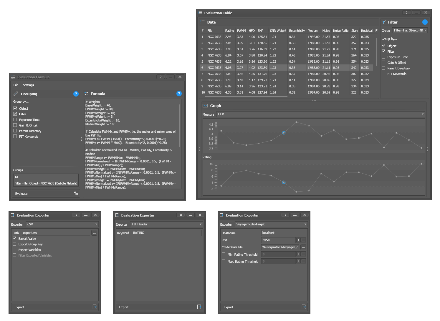 - Image statistics (Median, FWHM, HFR, Eccentricity, etc.)