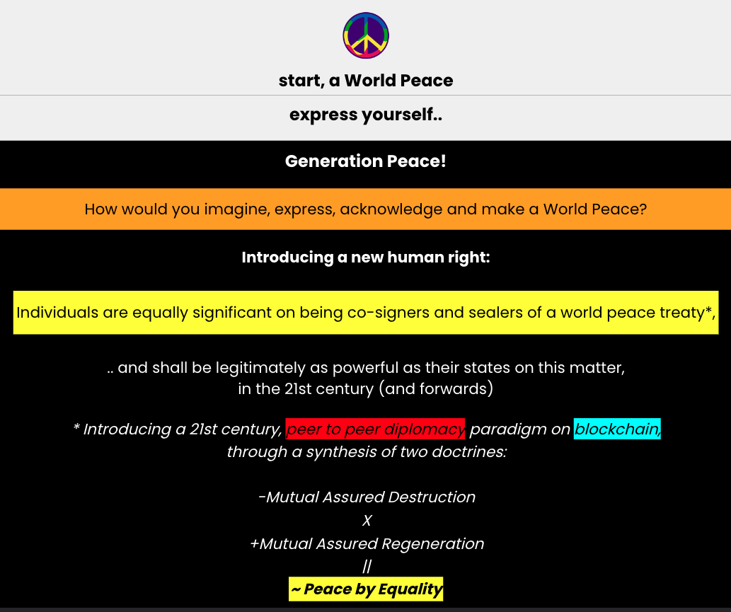 Expressions of Peace are sincere ways of resiliently, simply, expressing peace, being the core civil component of an undeniable, resilient World Peace.