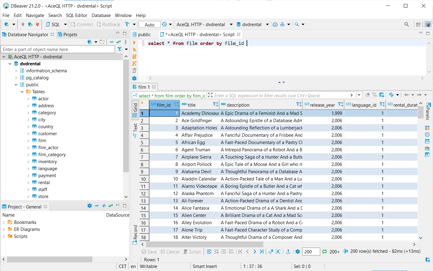 These snapshots show usage of a remote AceQL Connection in DBeaver:
