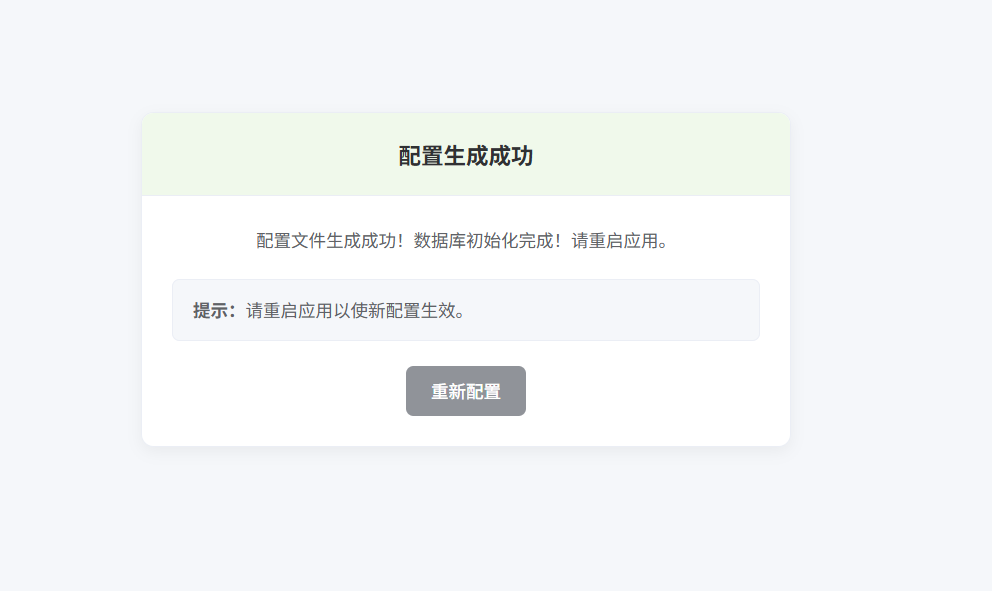 填写完后点击确认(系统会自动按照填写的信息完成初始化,导入sql、配置文件生成等),出现下面界面即为成功,重启即可