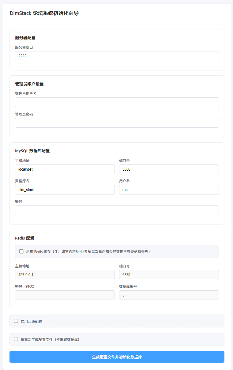 http://localhost:2223/init/setup按照初始化向导的提示填写:管理员用户名、密码、站点运行端口、日志级别、mysql信息以及redis信息等(默认信息不懂的话不要动)