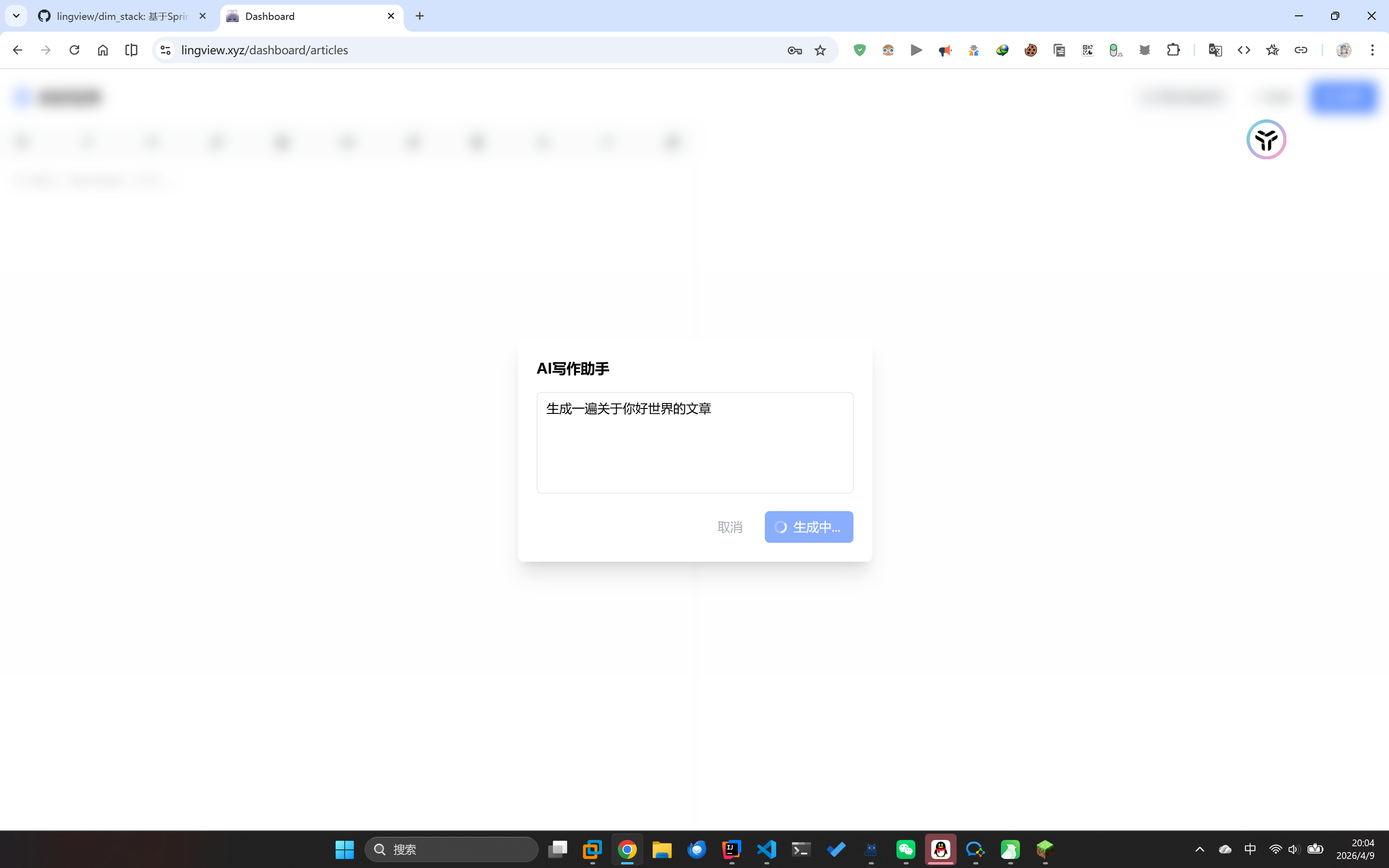 文章生成模块开启后用户可以在文章编辑器快捷调用大模型生成文章