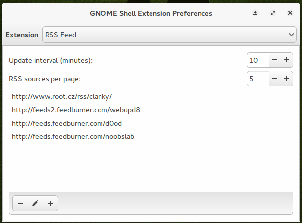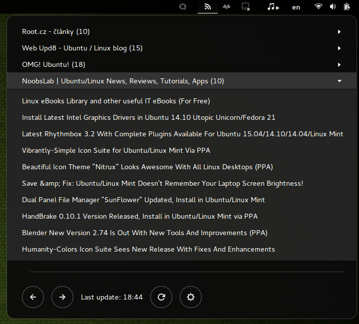 This extension adds button (RSS icon) to the GNOME Shell panel. After click on it, you can see your RSS Feeds in popup menu and navigate through them. When you click on some article, extension opens your default browser with it. Bottom bar contains buttons for navigating, refreshing and Settings tab.