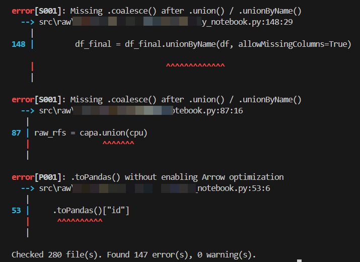 pyspark-antipattern check src/The job fails automatically if any error-level rule fires. Warnings are reported but do not block the pipeline.