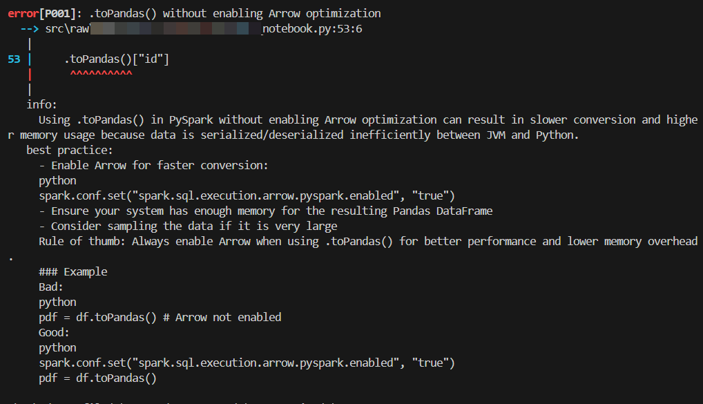 pyspark-antipattern check src/ --severity=medium # MEDIUM and HIGHWith show_information = true — inline explanation for each rule: