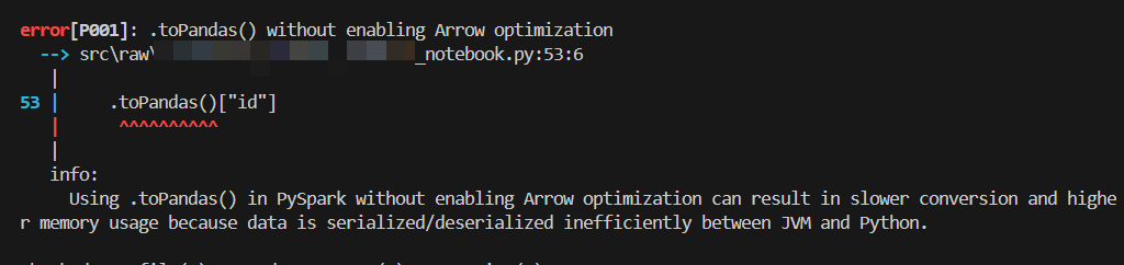PERF001 | Use .toPandas() — 10x faster with Arrow enabled |