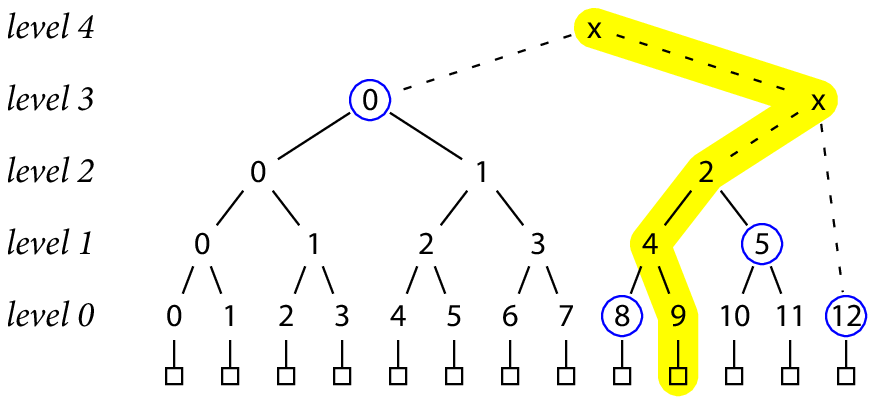 另一方式是使用中序遍历树的编号方式来安排 lg N 个哈希文件,这样每个父哈希都存储在其左右子树之间: