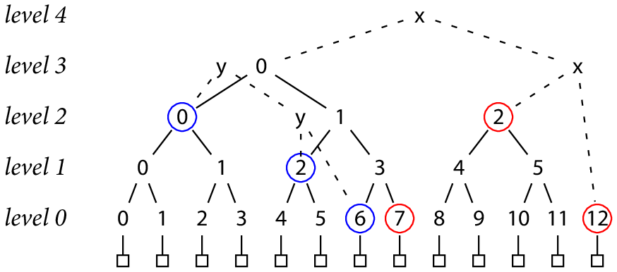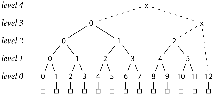 Crosby 和 Wallach 指出,使用二叉树的后序编号,可很容易地将 lg N 个哈希层级合并为 1 个仅追加的哈希文件中。其中父哈希存储在最右子节点之后。例如,写入 N = 13 条记录后,永久哈希树的结构如下: