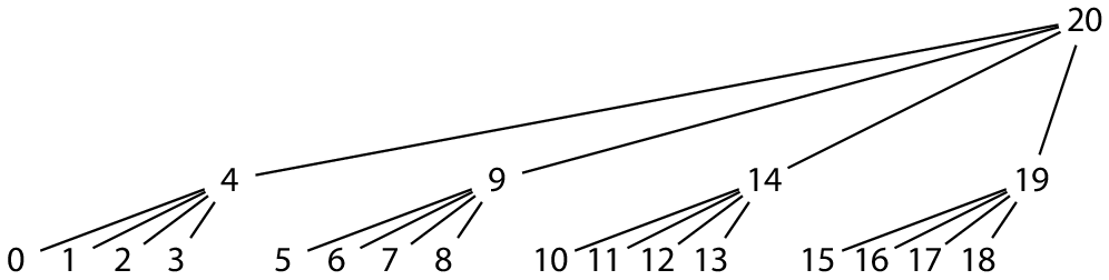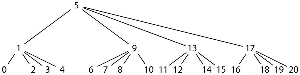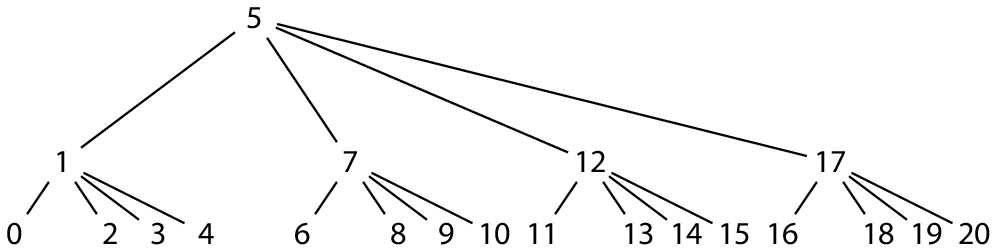 哈希文件在索引为 20 的数据位置之后不会写入任何瓦片,除非直到 20 之前的空隙已填充完(译注:此处描述的位置是:0 1 2 3 4 20 5 6 7 8 9 .... 17 18 19)。但然后又重复类似操作:在写完前面 20 个瓦片后会导致立即将接下来的第一个哈希写入到索引为 84 的瓦片中(译注:上图中 0-20 共 21 个瓦片整体将作为更大的四叉树的最左节点,因为是四叉树,所以还需 3 个类似上图的树才能拼凑出更大四叉树的 4 个节点,也即 21 * 4 = 84,实际大四叉树的根节点位置应在 84 之后即 85(从 1 起算的话),而因为本文一直以 0 起算索引值,所以文中说是 84)。一般化来说,文件中只有前面的 的哈希值是可保证相邻。大部分的系统都能高效支持文件中存在大孔,但也并非全部系统都支持:我们还是希望使用其他瓦片结构来避免大孔问题。