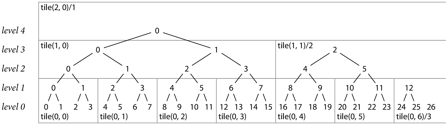 相反,我们必须简单地定义瓦片都是连续存储的,然再选择一个线性的瓦片布局顺序。对于高度为 2 的瓦片,这些瓦片形成一个四叉树,更通用地说应该是形成一个 叉树。我们可使用附录 A 中提到的后序布局: